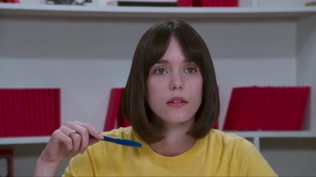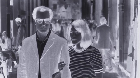 Hazanavicius jednocześnie opowiada tą historię jakby była filmem w stylu Godarda. Już na samym początku mamy narrację z offu od Anny, jak i (parę sekund później) od samego Godarda. A dalej jest jeszcze ciekawiej: przejście taśmy na negatyw, łamanie czwartej ściany, napisy na murach w tle, rozjazd dźwięku (sceny, gdy Godard rozmawia z Anną podczas pisania na maszynie – on się odwraca do niej i mówi, ale parę sekund jeszcze słychać maszynę), całkowite wyciszenie tła podczas rozmowy. Jest nawet scena, mocno inspirowana otwarciem „Kobiety zamężnej” (nie powiem jaka). Z jednej strony to bardzo odświeżająca i oryginalna forma, która pasuje do tematu oraz głównego bohatera, z drugiej to źródło sporej dawki humoru (scena dyskusji na temat nagości w filmie, po której następuje… o nie, to trzeba zobaczyć samemu).