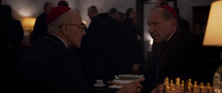 „Konklawe” chce być nazywane thrillerem politycznym i taką kościelna „Grą o tron”, tylko że nie do końca. Wszystko widzimy tak naprawdę z perspektywy Lawrence’a, przez co wiele rzeczy dzieje się poza kulisami. I jest to broń obosieczna. Z jednej strony razem z nim odkrywamy kolejne tajemnice oraz brudy kilku istotnych „graczy”, co pokazuje sporą sprzeczność. Kościół powinni tworzyć ludzie dążący do doskonałości, tworzą osoby słabe i grzeszne. Niby nic niezwykłego, ale nie myśli się o tym zbyt często. Z drugiej jednak strony, ta intymna perspektywa czyni całość bardziej kontemplacją niż stricte thrillerem. Bardziej jest to zderzenie światopoglądów: bardziej liberalnego i otwartego, który reprezentuje kardynał Bellini (świetny Stanley Tucci) oraz konserwatywnego o twarzy kardynała Tedesco (fantastyczny Sergio Castelitto, który kradnie ekran). Zaś nasz kardynał znajduje się w środku tego konfliktu, próbując się w tym odnaleźć.