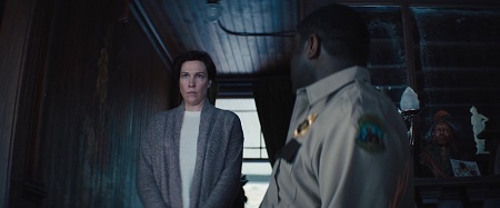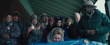 Jeśli akcja toczy się w (dużej części) zamkniętej przestrzeni, gdzie każdy staje się podejrzanym, inspiracja może być tylko jedna: Agatha Christie. Do tego dorzućmy, że zabójca jest wilkołakiem (polski tytuł już to zdradza, więc nie mówcie mi o spojlerach), to atmosfera robi się od razu gęstsza. Reżyser chętnie podrzuca horrorowe elementy (z naprawdę skutecznymi jump-scare’ami), myli tropy i cały czas podpuszcza. Bo może niby wilkołak jest (badania śladów przez dr Elis), ale może ktoś tutaj podpuszcza i prowadzi własną grę. Ktoś cały czas szczuje na siebie mieszkańców, chcąc pokazać ich obłudę, podłość oraz ich najgorsze cechy. Jest w tej grupie jeszcze odludek, Emerson Flint, mający jedną pasję – polowanie.